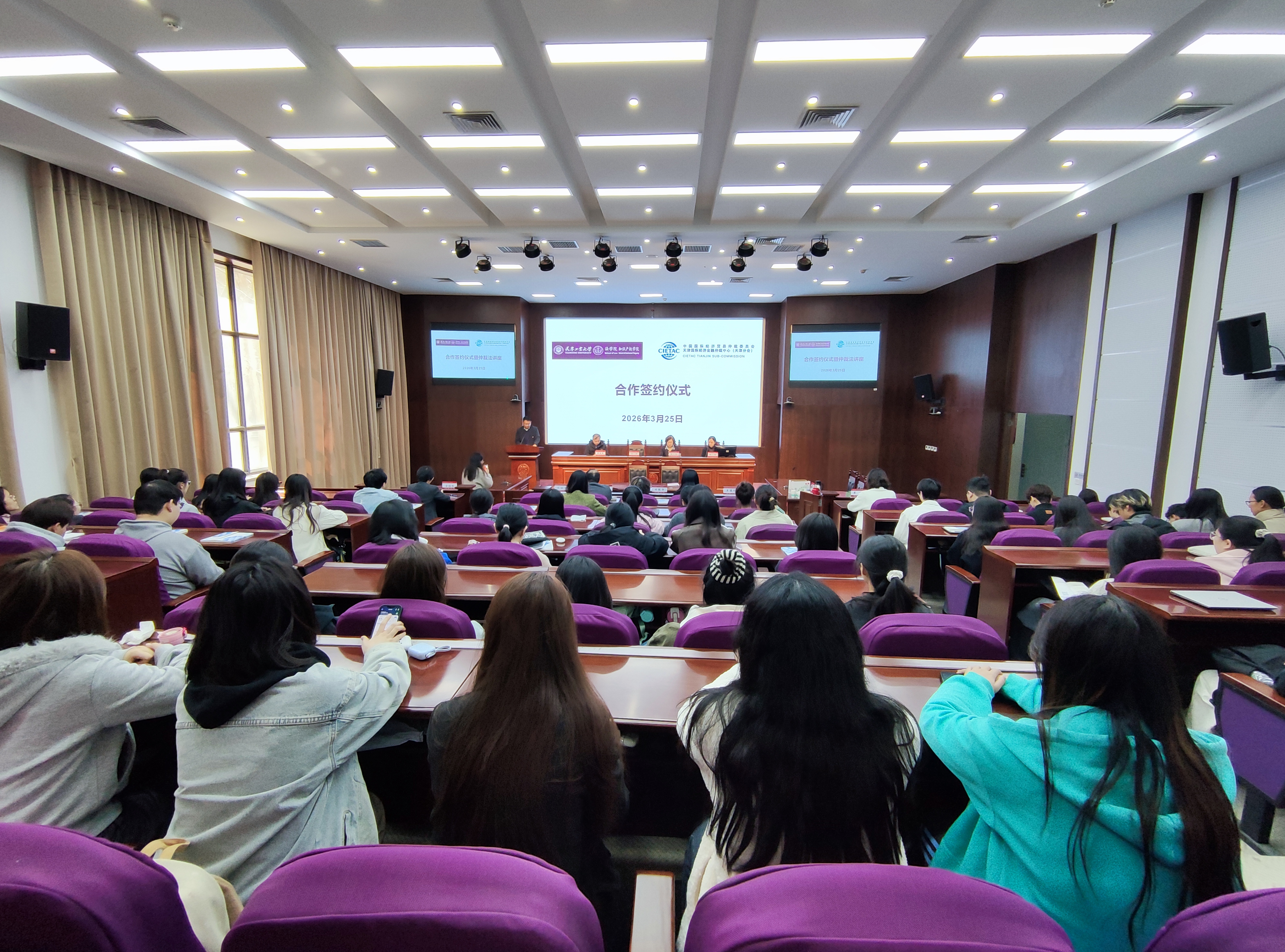 贸仲天津分会副秘书长赵英女士、天津工业大学法学院副院长韩其峰先生、李树成先生以及近百名师生参加了本次活动。本次活动内容丰富,反响热烈,活动取得圆满成功。