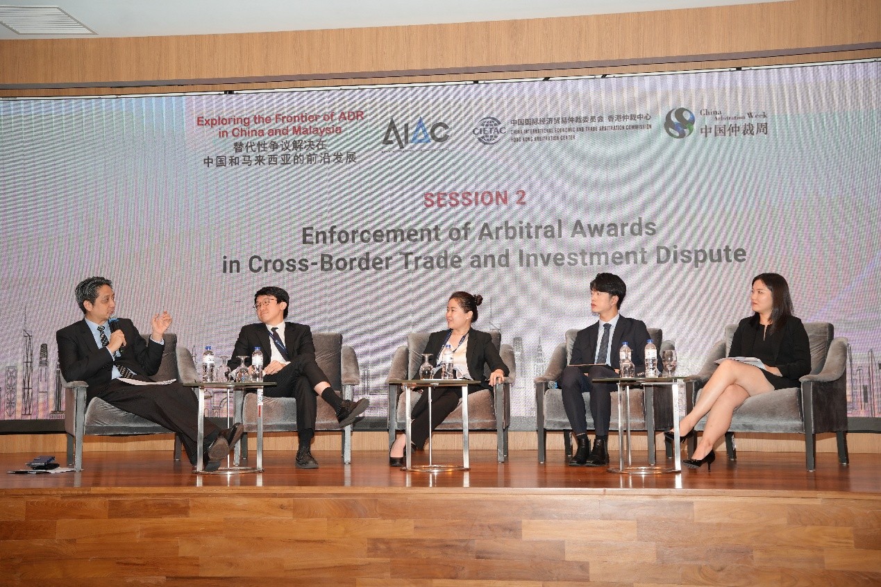 研讨会第二个环节以“跨境贸易和投资争端中的仲裁裁决执行”为主题,由亚洲国际仲裁中心助理主任余晶华女士主持。Tay & Partners律师事务所合伙人杨顺明先生(Leonard Yeoh)、贸仲香港仲裁中心法律顾问区锦涛、毅嘉大律师事务所苏颖先生、金诚同达(深圳)律师事务所顾问张晓宇女士分别就“中国和马来西亚仲裁裁决执行的法律框架(纽约公约及国内仲裁法)”“承认与执行外国仲裁裁决的程序”“中国和马来西亚关于仲裁裁决执行的公共政策例外与司法态度”等话题进行了分享和交流。区锦涛先生重点介绍了粤港澳大湾区仲裁裁决认可和执行制度的发展历史和现状,并结合实际案例,向与会观众分享了贸仲和贸仲香港仲裁中心在案件管理实践中保障裁决可执行性的具体举措和实务经验。