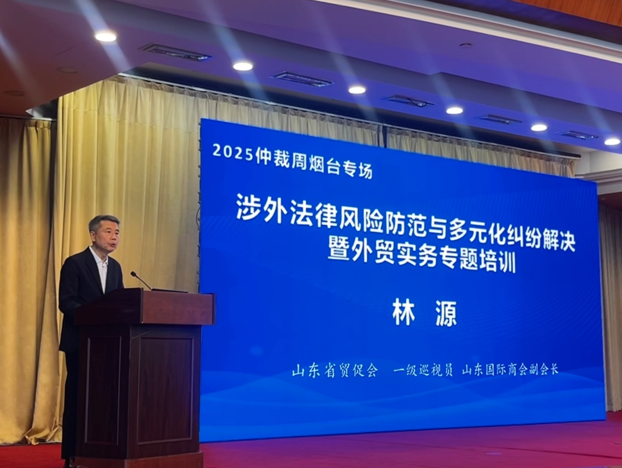 2025年10月16日,由中国国际经济贸易仲裁委员会山东分会(以下简称“贸仲山东分会”)、中国国际贸易促进委员会山东省委员会(以下简称“山东省贸促会”)、中国国际贸易促进委员会烟台市委员会(以下简称“烟台市贸促会”)主办的“中国仲裁周烟台专场活动——涉外法律风险防范与多元化纠纷解决暨外贸实务专题培训”活动在烟台成功举办。