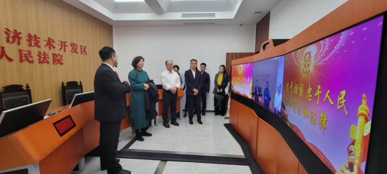 在自贸区法庭,调研团队实地参观诉讼服务区、审判区及法律文化区,通过座谈详细了解法庭运行成效。开发区法院分党组书记、院长于庆荣介绍,自贸区法庭自今年运行以来,已为辖区企业提供多项高效司法服务。解常晴现场回应合作意向,双方就共建多元化纠纷解决机制达成共识,为完善全市法治协同体系搭建关键桥梁。
