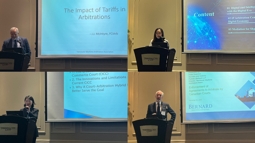 2025年11月20日,由中国国际经济贸易仲裁委员会(贸仲)与温哥华海事仲裁员协会(VMAA)联合主办,以“The Latest Hot Issues about International Commercial Arbitration: Focus on Canada and China Practices”(国际商事仲裁最新热点问题——聚焦加拿大与中国的实践)为主题的研讨会在加拿大温哥华成功举行。本次活动由贸仲北美仲裁中心承办,并获得加拿大国际贸易促进委员会、加拿大华人联合总会、加拿大赣商联合会、加拿大四川总商会、加拿大河北商会及加拿大齐鲁华人总商会等单位的大力支持。研讨会吸引了来自中加两国法律界、学术界及企业界的100余名代表参加。