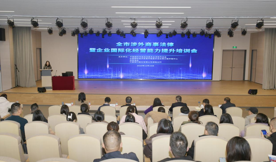12月16日,由中国国际贸易促进委员会渭南市支会(简称“渭南市贸促会”)联合中国国际经济贸易仲裁委员会丝绸之路仲裁中心(简称“贸仲丝路中心”)、渭南海关、中国银行股份有限公司渭南分行共同主办的“全市涉外商事法律暨企业国际化经营能力提升培训会”在渭南市成功举办。贸仲丝路中心副秘书长蒋红梅出席培训并致辞,渭南市贸促会副会长杨玉婷主持培训。