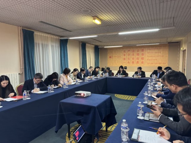 2025年12月19日,法国中国工商会在巴黎华天中国城酒店召开第五届理事会第1次工作会议。中国驻法国大使馆代俊鹏参赞出席会议并讲话。会议由法国中国工商会秘书长、中国贸促会驻法国代表处副总代表李文国主持。