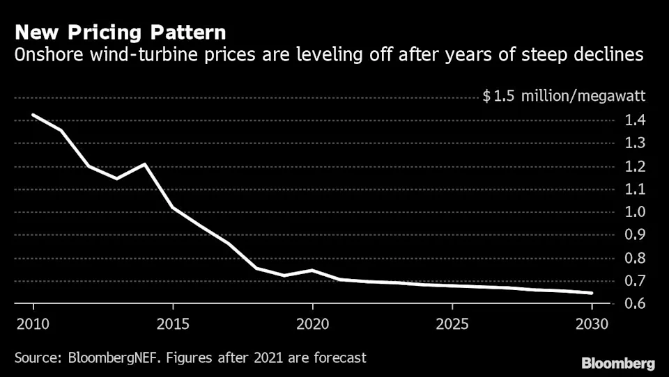 风能行业正在经历类似的转型。数据显示,在截至2020年的10年里,风力发电价格下跌了48%,但现在趋于平稳,预计到2030年仅会下跌14%。有分析师指出,“这是行业日趋成熟的迹象。”