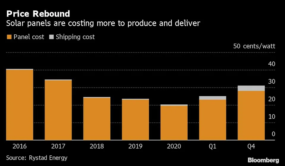研究公司Rystad Energy高级分析师David Dixon说,原材料现在占成品模块成本的70%,这让供应商几乎没有削减成本的空间。多晶硅是制造太阳能电池板的光伏电池的关键材料之一。由于多晶硅短缺,去年的成本增加,运输成本也上升了。